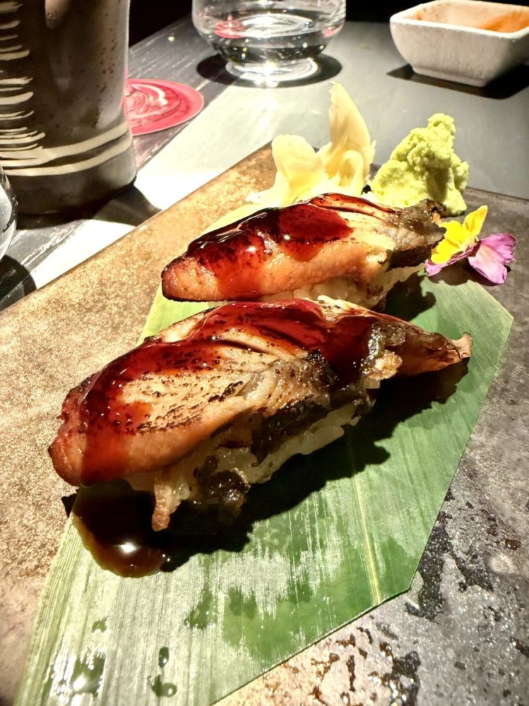 Les makis à l’anguille arrivent ensuite, riches et délicats, suivis de brochettes de Saint-Jacques et de poulet : cuisson impeccable, assaisonnement précis, rien de superflu. Tout est équilibré, élégant, sans jamais tomber dans le trop démonstratif.