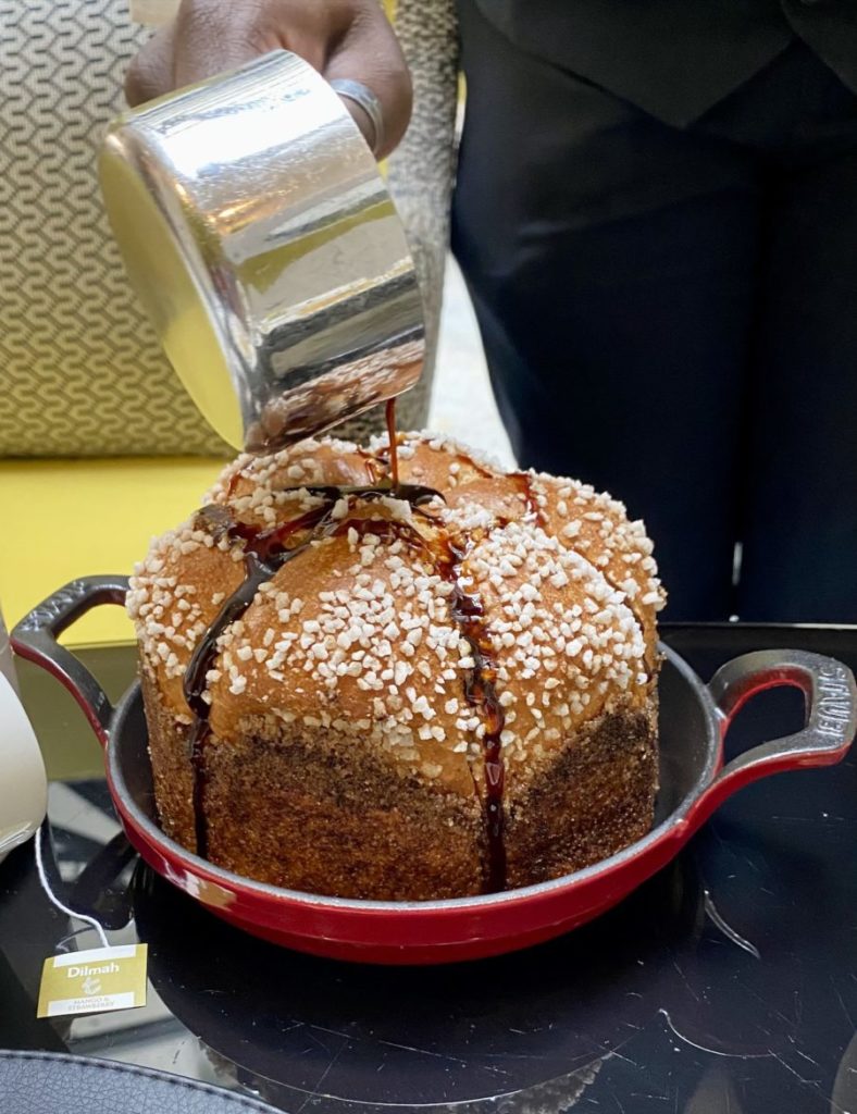 Assis sous la grande verrière, le ballet de douceurs démarre : un thé choisi à la carte, des pâtisseries soigneusement alignées, une brioche toute dodue décorée d’un sirop de sucre.
