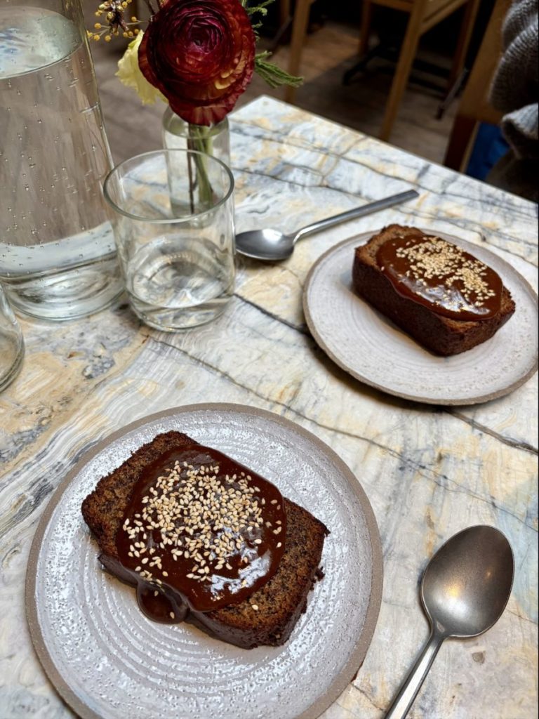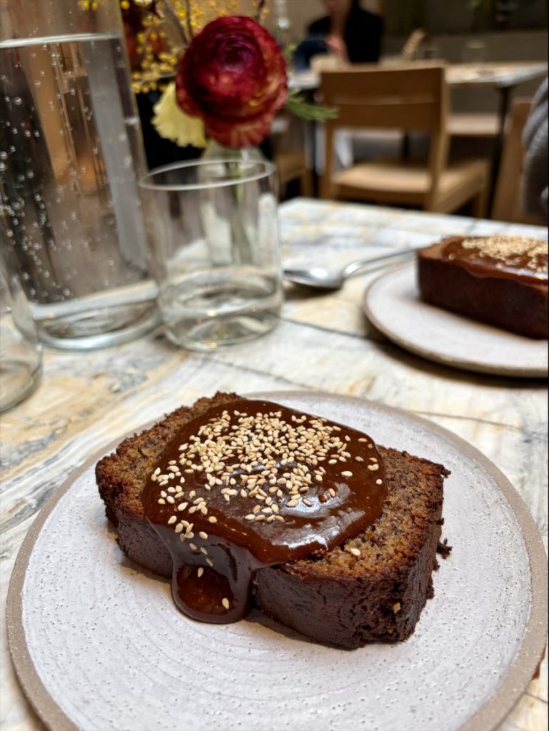 Mais la vraie surprise de ce repas arrive au moment du dessert et voilà longtemps que je voulais le tester : le banana bread signature est une institution. Ici, il est revisité avec un praliné miso servi tiède, et autant dire que l’association intrigue autant qu’elle séduit. Moelleux, pas trop sucré, avec ce goût de banane bien présent mais jamais écœurant. Le praliné miso, lui, apporte une profondeur inattendue : une légère note salée, un côté noisette, qui vient le rendre incroyablement addictif. C’est subtil, audacieux, et très réussi !